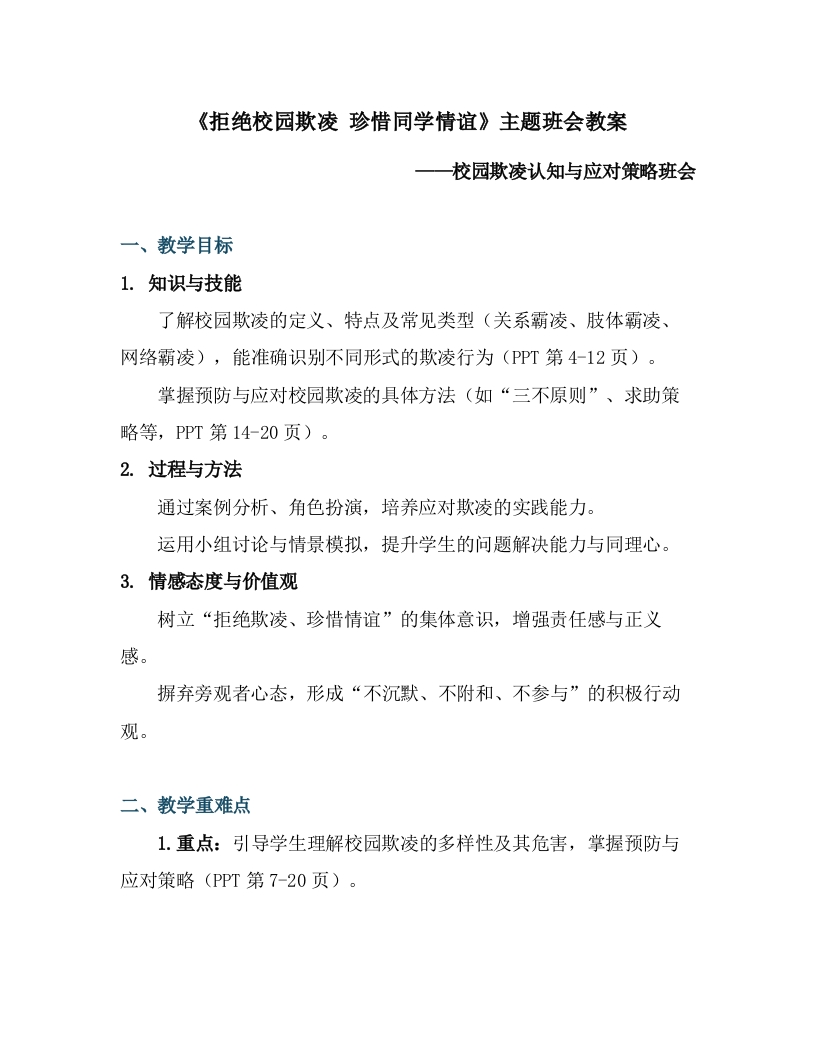 首页教研资料《拒绝校园欺凌 珍惜同学情谊》教案