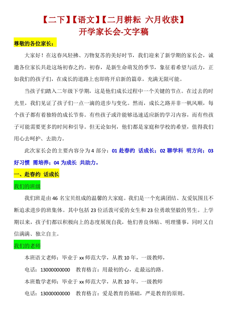 【二下】【语文】【二月耕耘 六月收获】开学家长会-文字稿