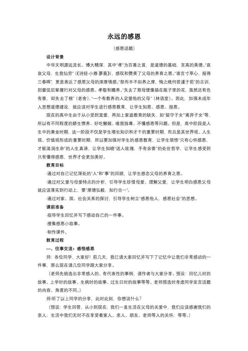【感恩话题】《永远的感恩》感恩教育主题班会教案