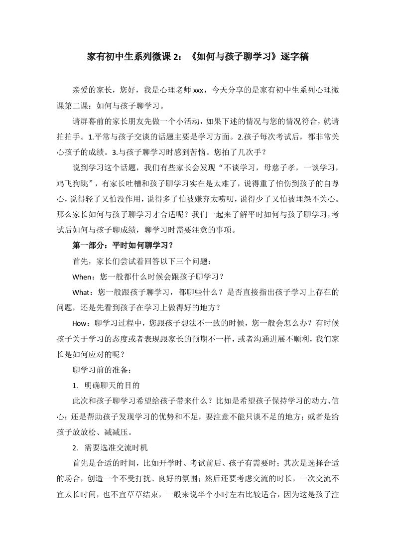 家有初中生系列微课2:如何与孩子聊学习(逐字稿)
