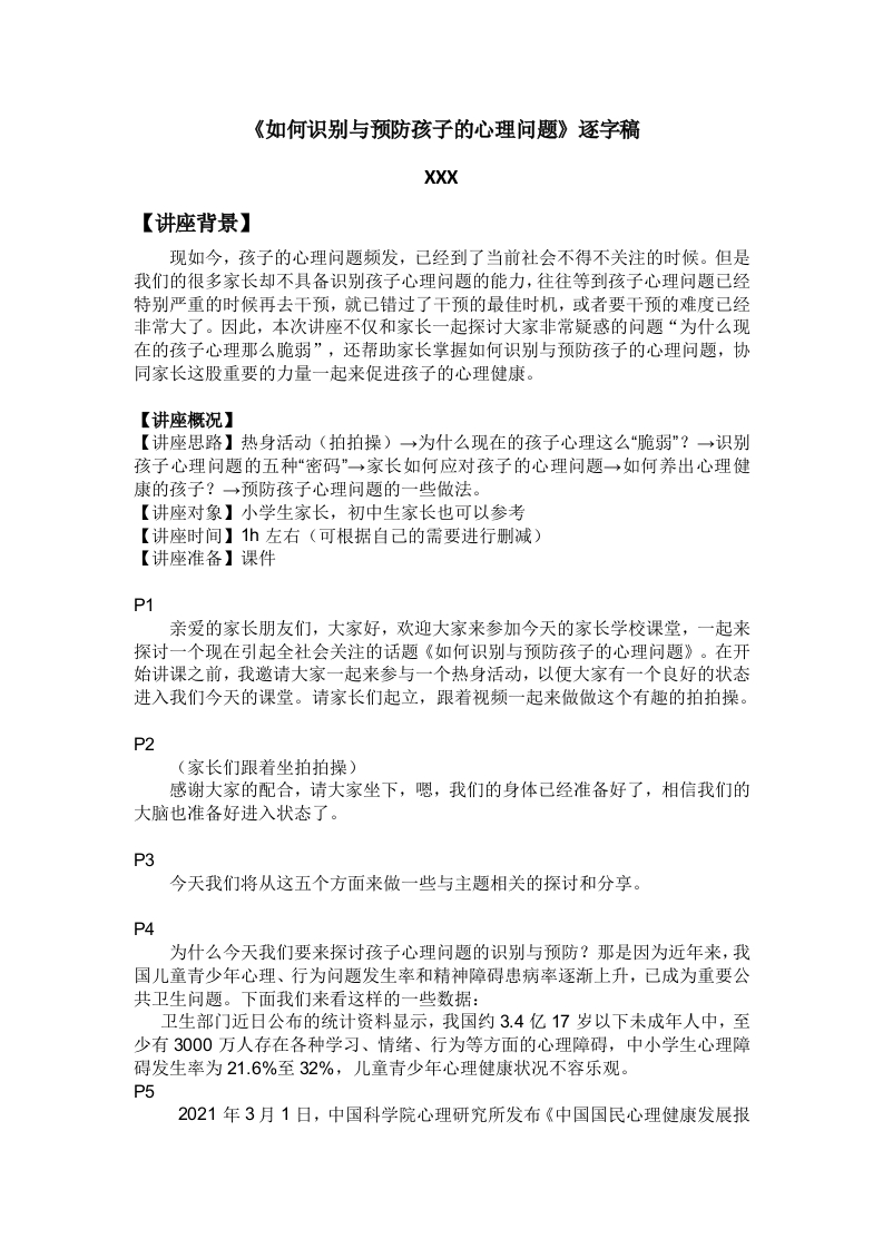 《如何识别与预防孩子的心理问题》(逐字稿)