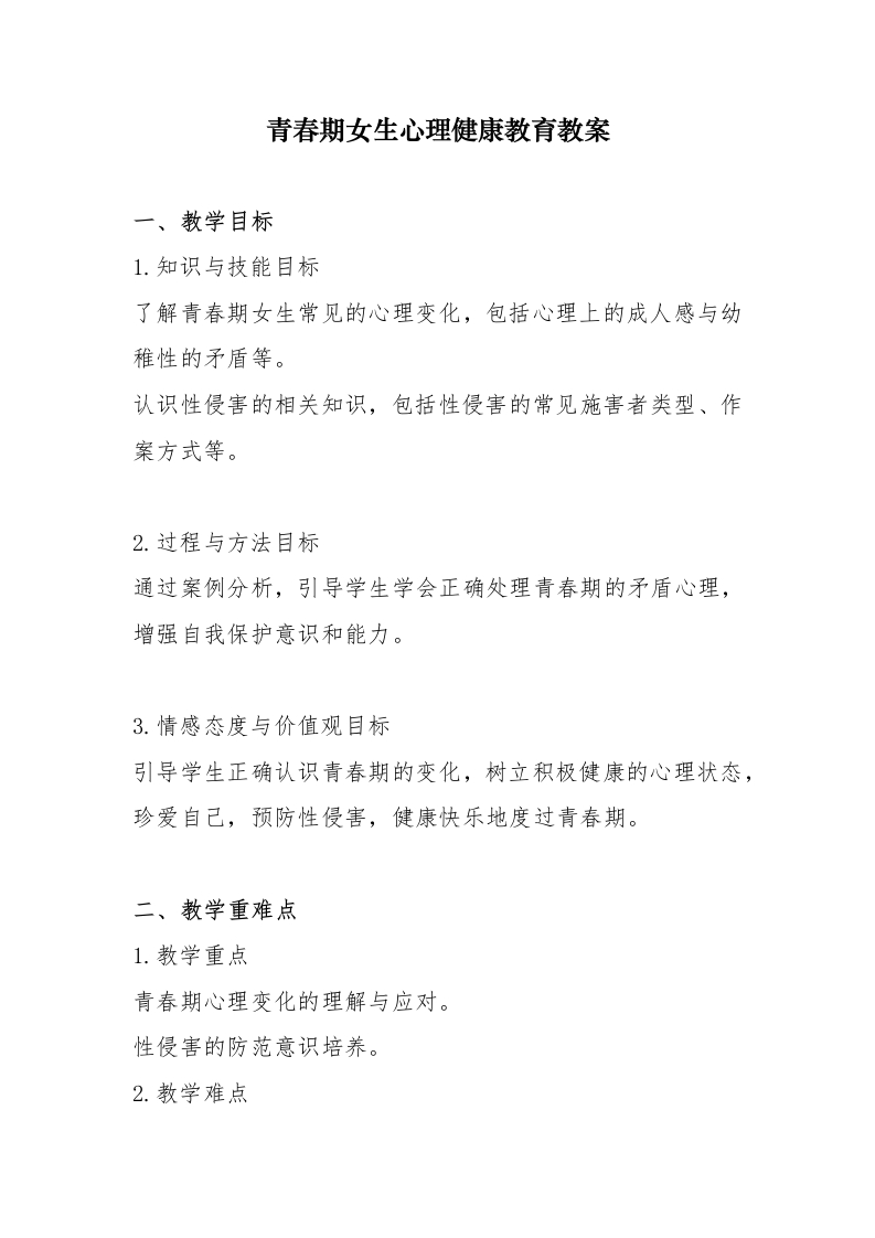 青春期女生心理健康教育教案